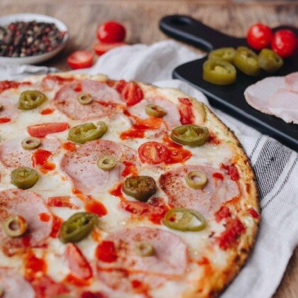Классическое тонкое итальянское тесто, замешанное на оливковом масле, протёртые томаты с добавлением базилика, сыр Моцарелла, свежие томаты, куриное филе, сыр Крем чиз, оливки, соус "Терияки".