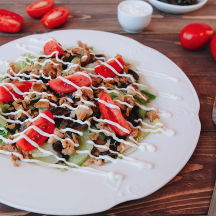 Салат Айсберг, свежий перец, свежий огурец, рассольный сыр Фета, красный лук, помидоры Черри, маслины, оригинальный соус на основе оливкового масла